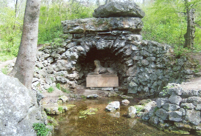 Farbfoto: Die Sphinx in der Sphinxgrotte an der Quelle von dem Fluss DIE LEUTRA im Park an der Ilm in Weimar im April des Jahres 2012. Fotograf: R. I.